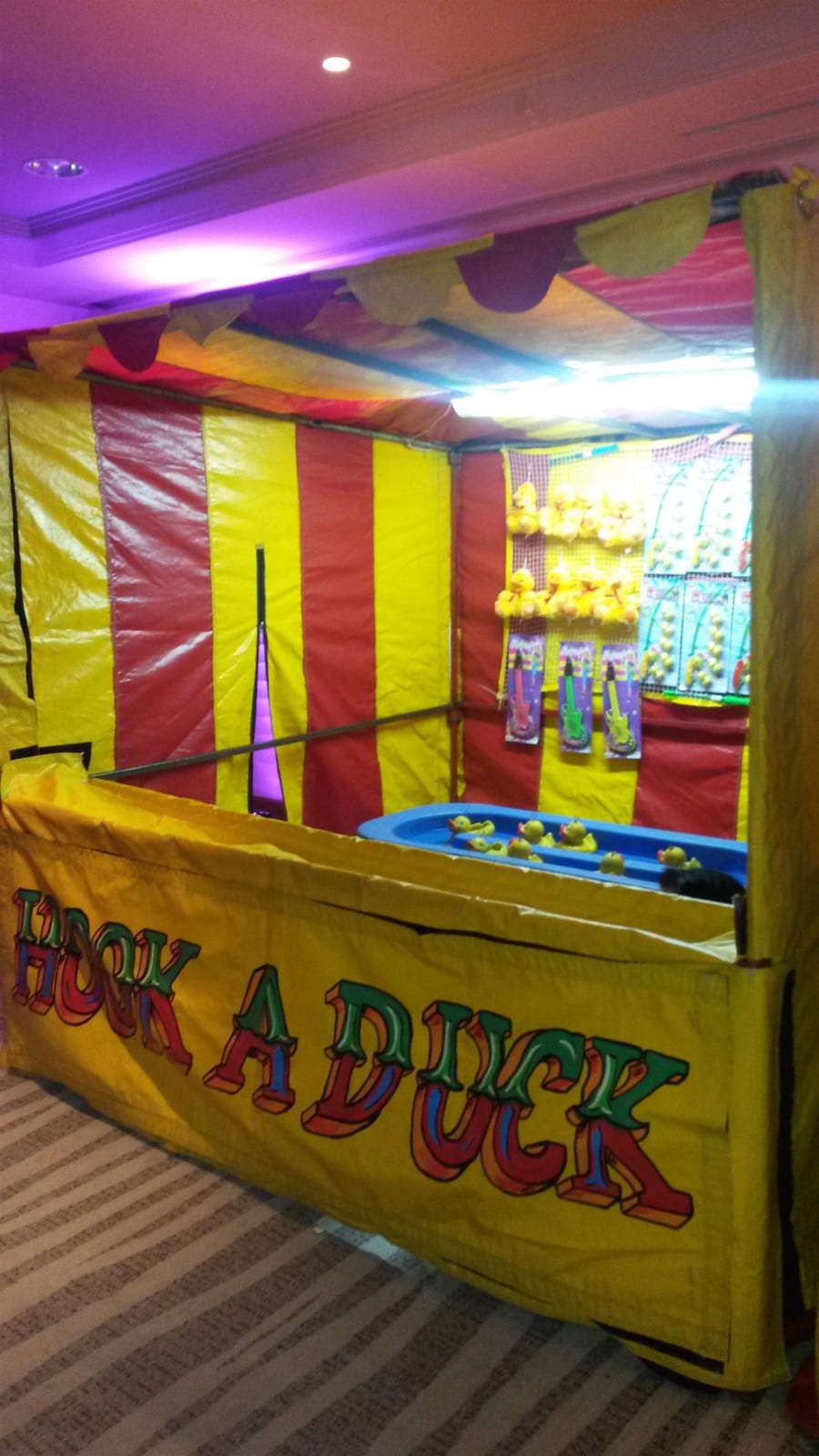 Our hook-a-duck stall is stunningly eye-catching with its bright contrasting colours and traditional fairground lettering. And who can resist the challenge of hooking one of the bright yellow plastic ducks bobbing up and down in a water trough - plus the reward of a soft toy prize? It sounds so easy and simple, everyone will want a go.